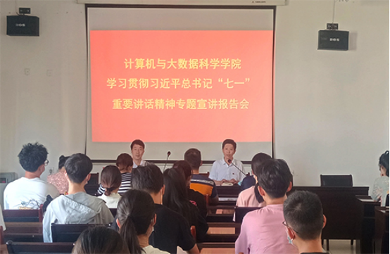 为深入学习贯彻习近平总书记“七一”重要讲话精神, 9月26日下午,Beat365唯一官方网站在文友楼424举行学习贯彻习近平总书记“七一”重要讲话精神专题宣讲报告会。校马克思主义宣讲团成员、马克思主义学院形势与政策教研室主任夏仕教授作宣讲报告。计算机学院党委书记袁宜如主持报告会。