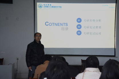 殷超博士在动员报告中详细介绍了复试流程、复试内容、复试准备以及相关注意事项。提醒同学们应该及早准备,周密制定复试学习计划,不打无准备之战,并针对性的指导考生如何应对考研复试及调剂的具体事宜。会后,不少同学就调剂问题与参会老师们进行了深入的交流。