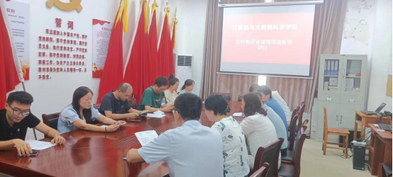2023年6月12日,在文友楼425党员活动室,软件工程教研室召开了课程思政教学研讨会,会上大家一起学习了“学习强国”APP上的相关报道并结合教学谈了课程思政建设的体会。