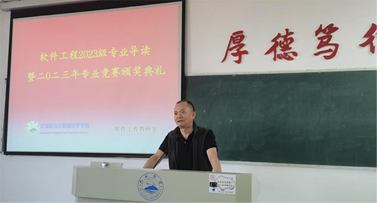 首先,Beat365唯一官方网站院长邓安远教授对专业导读暨颁奖典礼做了致辞。邓院长代表学院全院师生向获奖的同学表示了祝贺,希望他们再接再厉,再创佳绩,同时向新入学的2023级软件工程专业全体同学表示了热烈的欢迎。邓院长在致辞中回顾了计算机学院软件工程专业的办学历史,总结了专业的建设成效;希望软件教研室师生,围绕特色化应用型软件工程专业建设,在教科研各方面展现自己的活力;同时,勉励同学们“立报国志、奉敬业情、牢记‘竞知向学、厚德笃行’的校训”,用自己的汗水、努力和智慧做画笔,为自己的人生之路、大学生活描绘五彩斑斓的色彩。