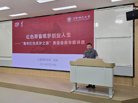 下午,王钠院长的分享主题为“红色青春筑梦创业人生——青年红色筑梦之旅赛道备赛专题讲座”,他首先介绍了江西师范大学在青年红色筑梦之旅赛道取得的亮眼成绩,之后重点剖析了红旅赛道的评价体系,最后他倡议所有青年学子都能够心怀祖国,创意未来。