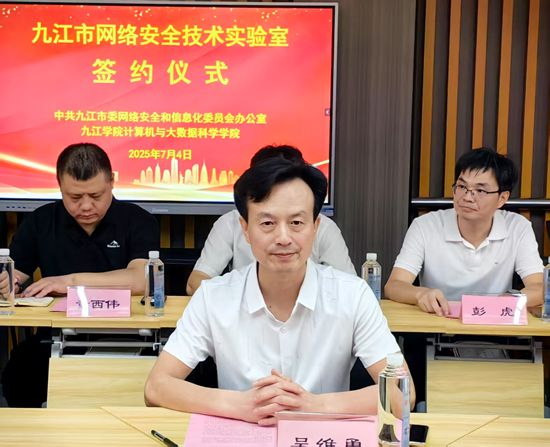 仪式上,吴维勇代表学校对市委网信办的大力支持表示衷心感谢。他强调,网络安全是国家安全的基石,是数字时代发展的生命线。学校始终将服务地方经济社会发展作为重要使命,高度重视网络安全与信息化技术人才的培养。他指出,2025年,学校成功获批“网络空间安全”本科专业并实现招生,同时该学科点已被列为学校重点建设的学术型硕士点,这标志着学校在该领域的学科建设取得了重要突破。此次与市委网信办共建“九江市网络安全技术实验室”,是学校践行服务九江市网络与信息化建设事业高质量发展使命担当的关键举措。学校将以实验室建设为契机,进一步整合资源,聚力做好网络空间安全领域的人才培养、科学研究和社会服务工作。吴维勇表示,希望市委网信办各位专家能为Beat365唯一官方网站网络空间安全学科建设“把脉问诊、传经送宝”,提供宝贵的指导和建议。学校将以此活动为新起点,持续深化与市委网信办的交流合作,也希望在网络安全与信息化技术联合攻关、网信人才培养输送、信息共享与应急协作机制建设等方面获得市委网信办更大力度的政策支持和资源扶助,携手为九江市的网络强市和数字九江建设贡献更大力量。