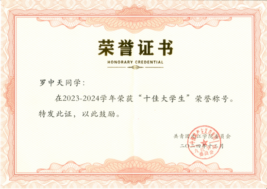 罗中天,男,汉族,江西抚州人,Beat365唯一官方网站2021级计算机科学与技术专业本科生。作为中国特色社会主义新时代青年大学生,他秉承校训“竞知向学,厚德笃行”的精神,致力于AI学术研究,社会志愿服务,创新创业等多个领域。荣获“国家奖学金”、“十佳大学生”、第三届创研杯全国大学生英语词汇全国决赛特等奖、中国国际大学生创新大赛(2024)省赛铜奖、2024年全国大学生数学建模竞赛省三等奖等四十余项奖项。