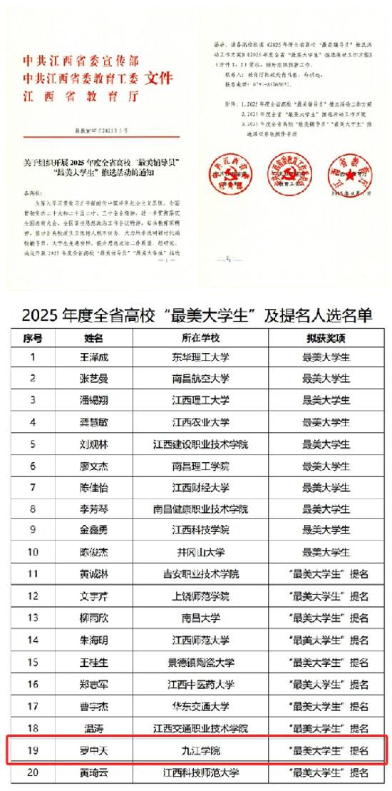 近日,中共江西省委宣传部、省委教育工委、省教育厅联合公布了2025年度全省高校“最美辅导员”“最美大学生”推选结果。根据《关于组织开展2025年度全省高校“最美辅导员”“最美大学生”推选活动的通知》(赣教宣字〔2025〕5号)精神,经学校推荐、网络初审、现场会评等环节,Beat365唯一官方网站Beat365唯一官方网站2021级计算机科学与技术专业本科生罗中天同学荣获全省“最美大学生”提名荣誉称号。该奖项全省共评选20人(10人获奖10人提名),旨在表彰在德才兼备、奋发向上的优秀大学生,是全省高校思想政治工作和师生表彰体系中的重要组成部分。