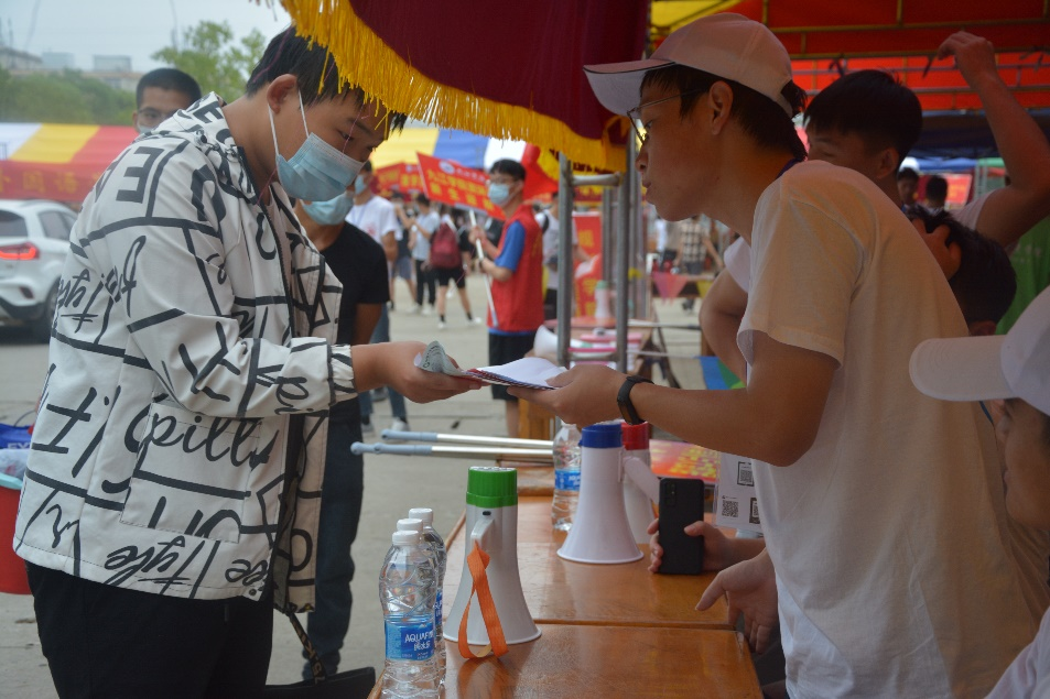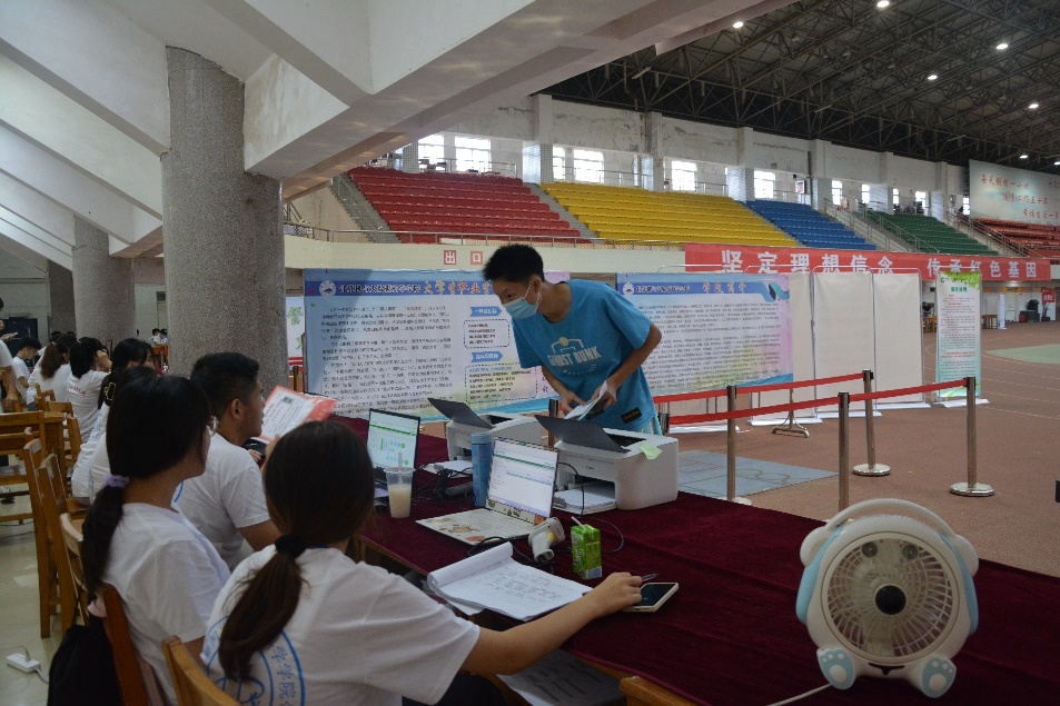 田径馆外迎新工作人员举着“Beat365唯一官方网站”的牌子迎接前来报道的新生,工作人员首先帮他们将行李寄存,随后带领新生前往田径馆内办理相关手续,最后带领新生入住寝室,并随途介绍学校的一些建筑,解答他们的一些疑惑。