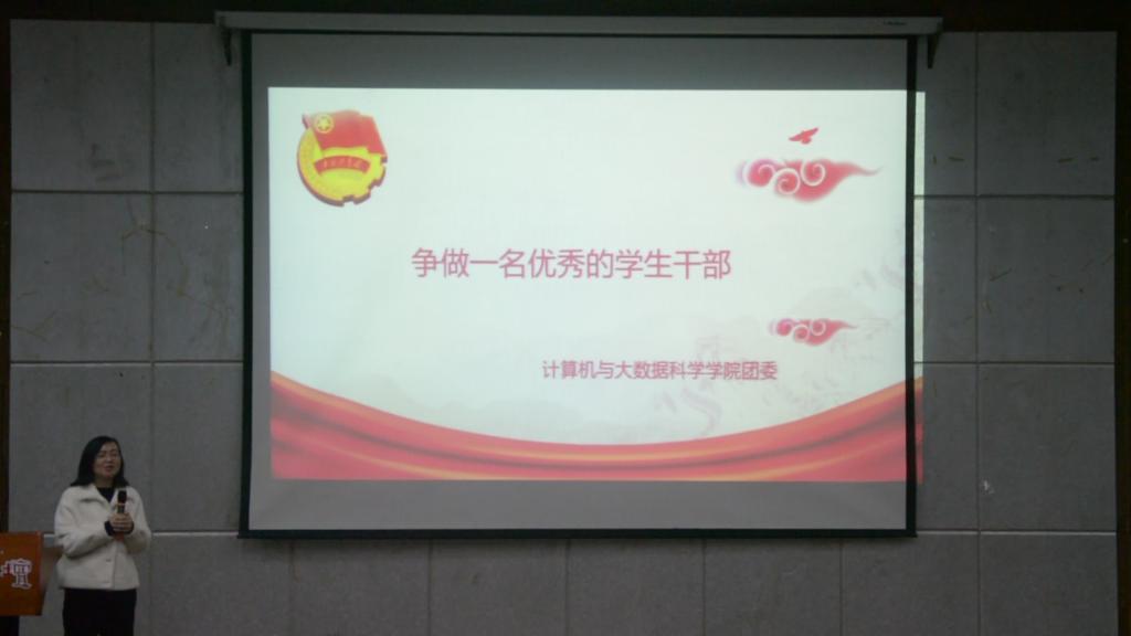 开班仪式结束后,胥老师以“争做一名优秀的学生干部”为主题进行开班第一讲。本次讲座主要分成了三个部分,首先成为一名学生干部,其次要努力做好学生干部,最后是力争成为优秀干部。胥老师用她的个人经历和学长学姐的工作态度为例,为我们讲述一名学生干部应该起到哪些作用,具备怎样的综合素质及能力,一名优秀的学生干部应该全心全意为同学们服务,并且要将学习放在最重要的位置,而且在这条成为优秀学生干部的路上不留遗憾。最后本次骨干培训课在全体成员嘹亮的团歌声中圆满结束。