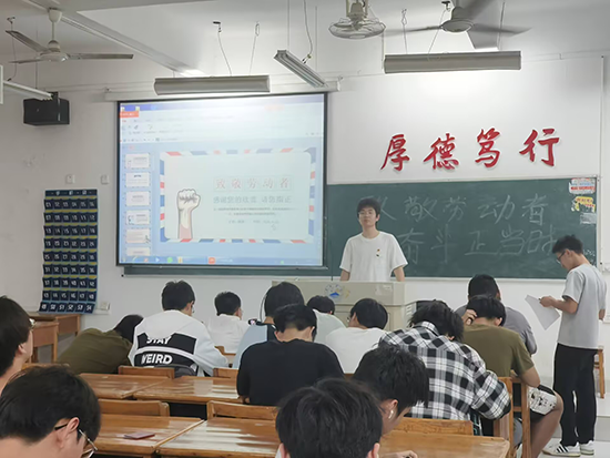 首先,团支书通过纪录片展播和主题宣讲,生动展现了不同行业劳动者坚守岗位、无私奉献的感人事迹,同时也深入阐释了“劳动最光荣、奋斗最幸福”的价值理念。在互动环节,全班围绕“青春如何书写奋斗篇章”展开热烈讨论,同学们结合自身实际畅谈对劳动精神的理解。此外,各班级还举办了“致敬身边劳动者”故事会,通过讲述校园后勤人员、实验室管理员等普通劳动者的感人故事,深化了同学们对劳动价值的认识。