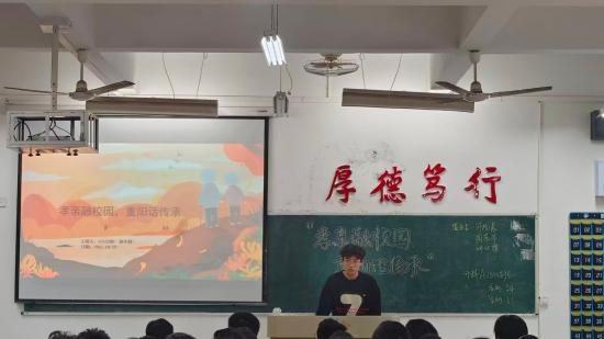 活动现场布置紧扣主题,投影屏呈现“孝亲融校园,重阳话传承”的温馨画面,黑板同步书写活动主题,营造出浓厚的文化氛围。在分享环节,同学们结合自身经历讲述孝亲故事,从日常陪伴长辈到参与敬老志愿服务,生动诠释了传统美德在当代青年中的实践与延续;互动交流中,大家围绕“如何在校园生活中践行孝亲理念”展开讨论,提出了“给长辈录制校园生活vlog”“组织敬老主题志愿活动”等创意想法。